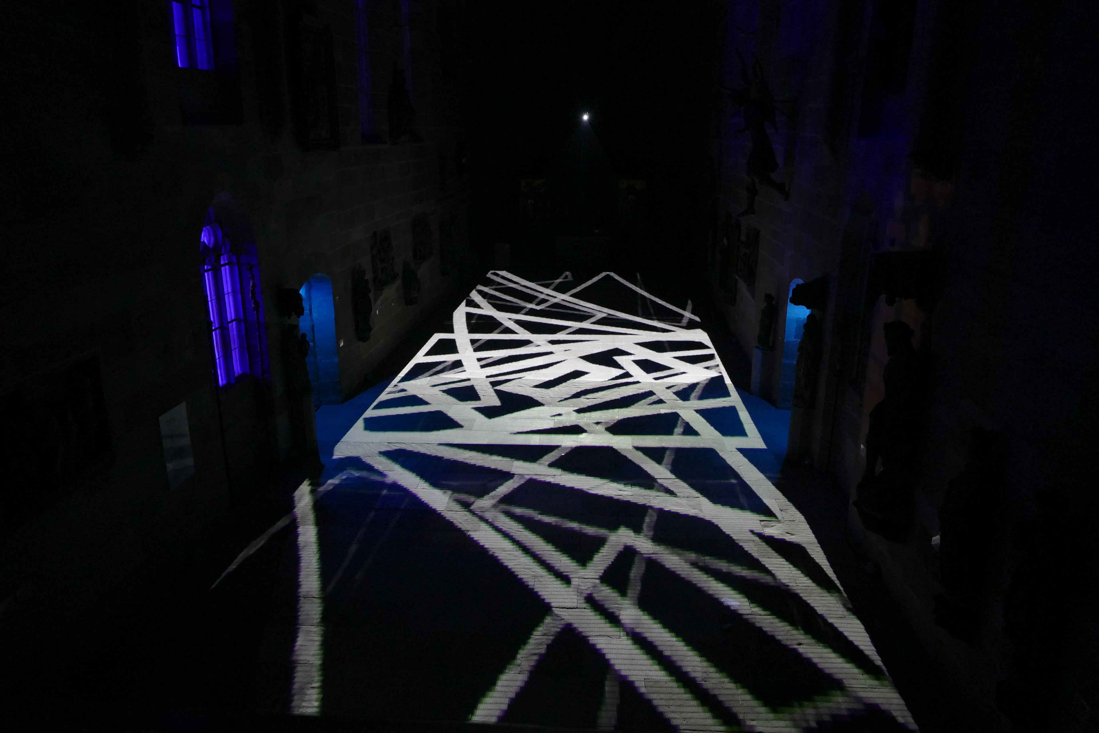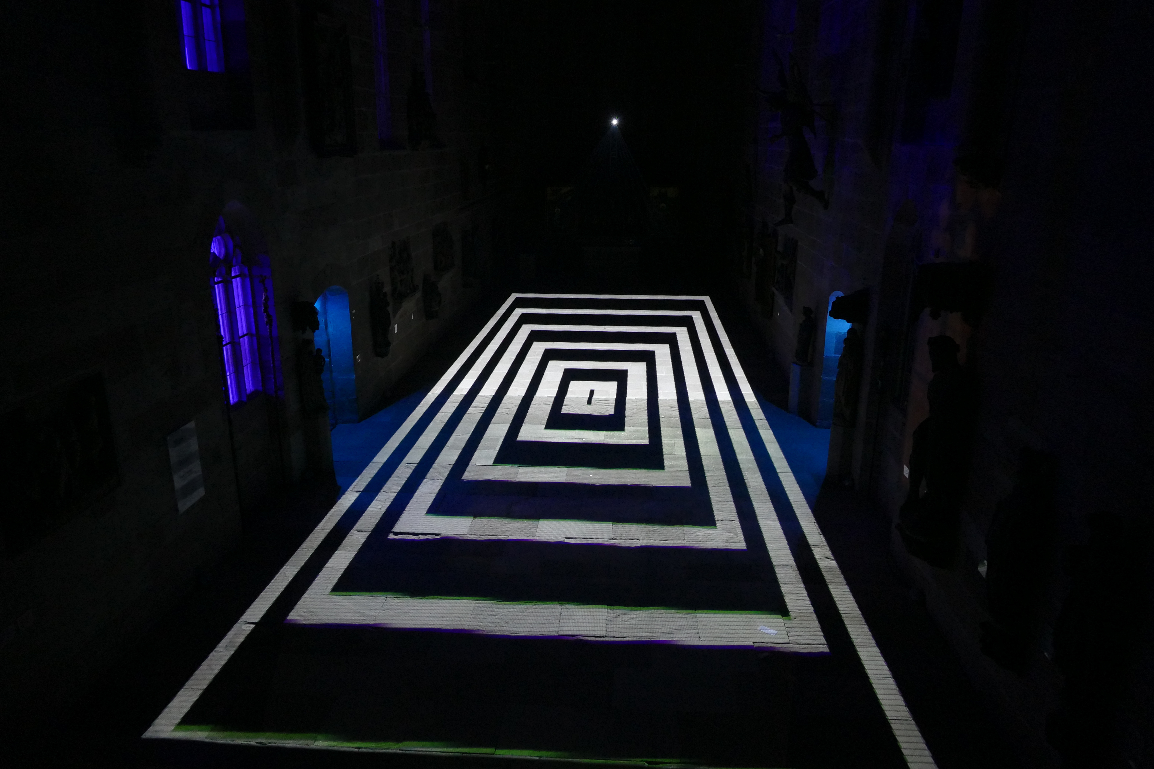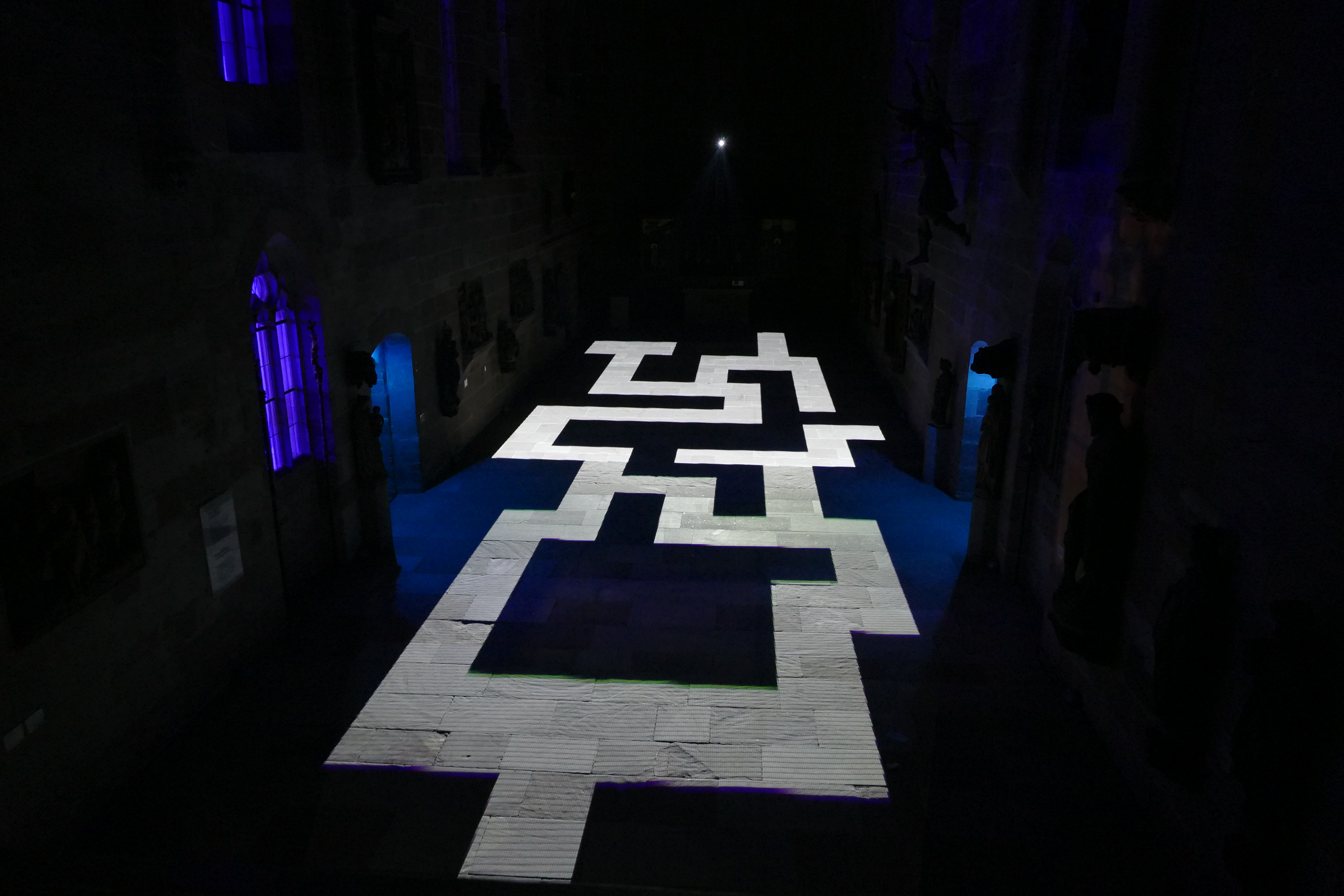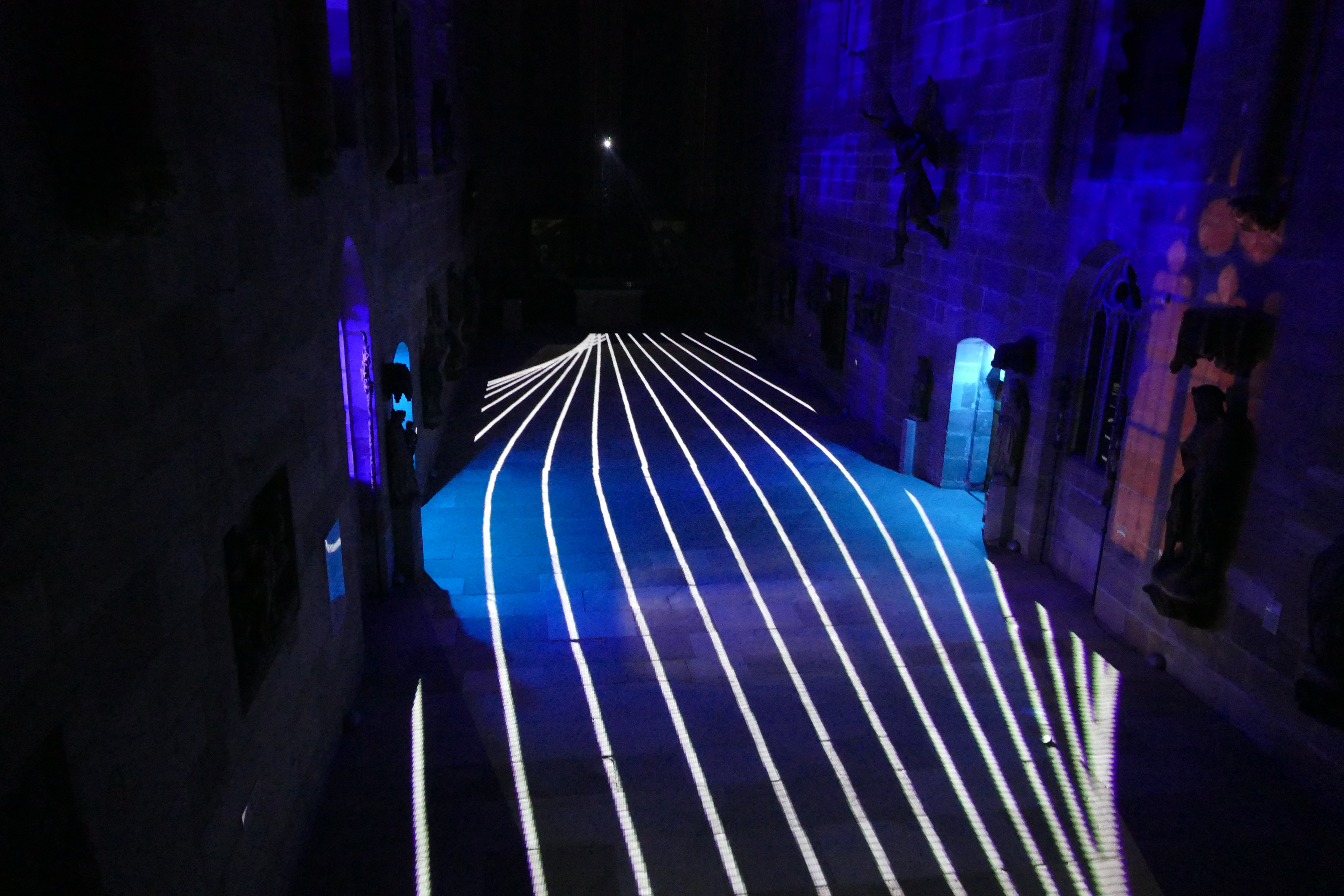 Videoinstallation im Germanischen Nationalmuseum Nürnberg, 2017 Sobald es dunkel ist, wird der Boden der Kartäuserkirche zur Projektionsfläche. Die audiovisuelle Installation Mäander skizziert mögliche Routen durch den Raum, die sich als Irrwege entpuppen und die Frage nach dem richtigen Weg stellen. Wasser fließt in der Natur nicht geradeaus, es fließt in Mäandern. Die dynamischen Linienkompositionen suchen sich ebenso ihren Weg durch den Raum und werden zunehmend rasanter bis sie sich in einer Flut aus Licht und Sound auflösen. Der Lichtteppich startet mit einem wasserähnlichen Bild und endet mit einem Kreissymbol. Alles, was dazwischen stattfindet, repräsentiert einen zeitlich verkürzten Lebensweg, eine Odyssee des Alltäglichen. Lichtstrahlen stellen eine Verbindung zwischen den Besuchenden und dem Ort her. Im Sinne des Konzepts vom erweiterten Kino (oder: expanded Cinema), wird die Projektion von üblichen Display gelöst und kann von den Betrachtenden sogar durchschritten werden. Das Publikum wird in die Präsentation eingebunden. Anstelle der kontemplativen Werkbetrachtung tritt die ephemere, multisensonale Kunstrezeption.