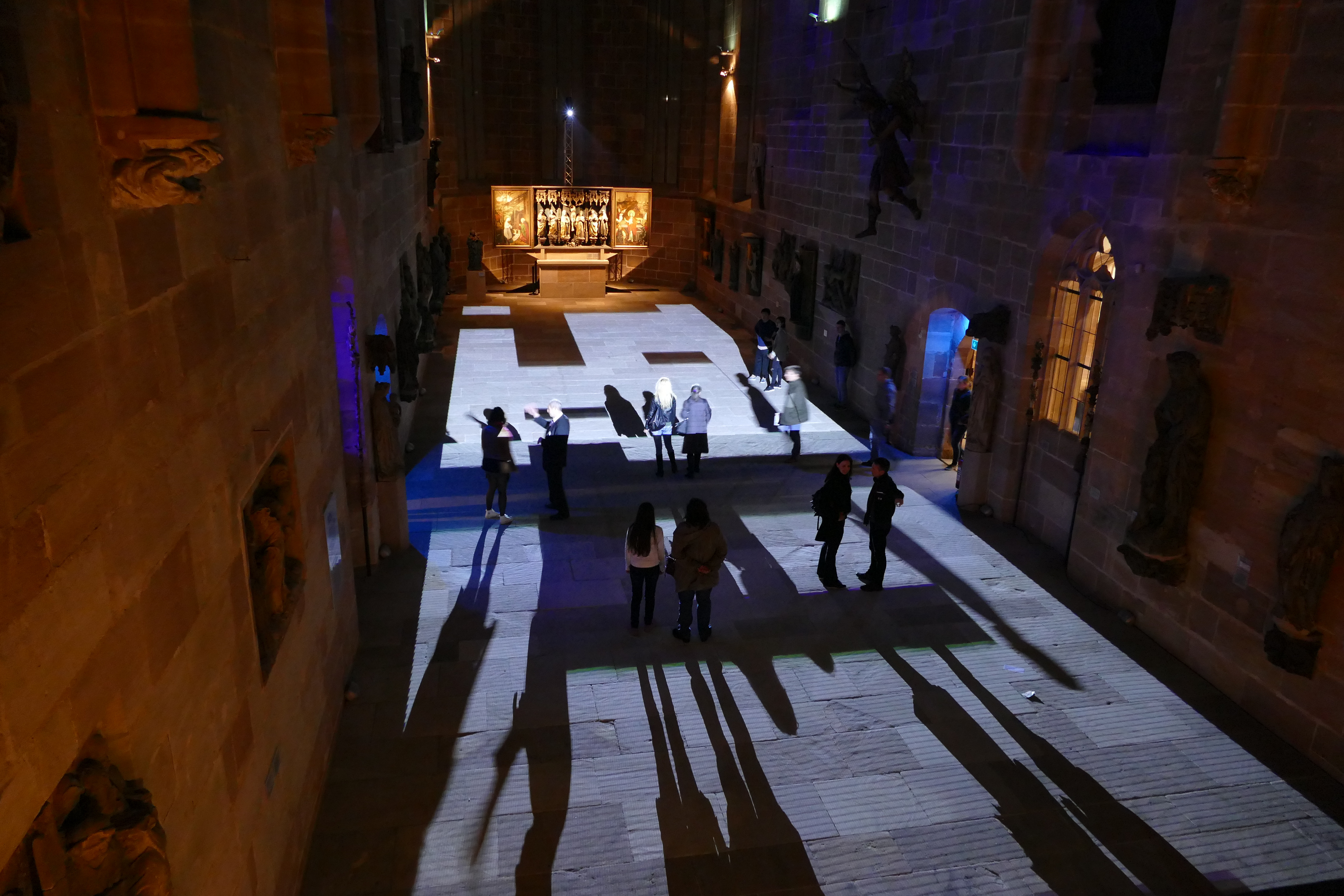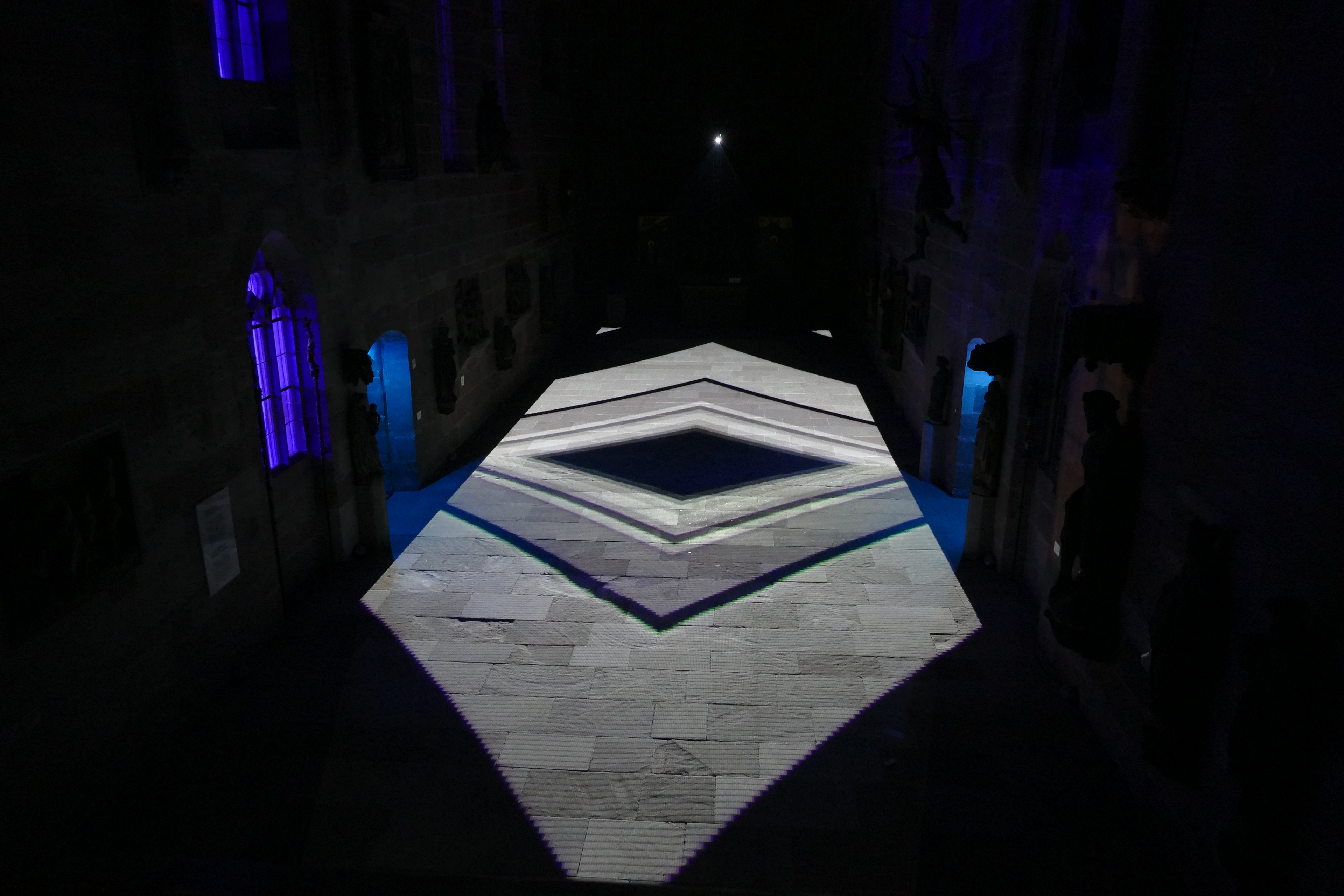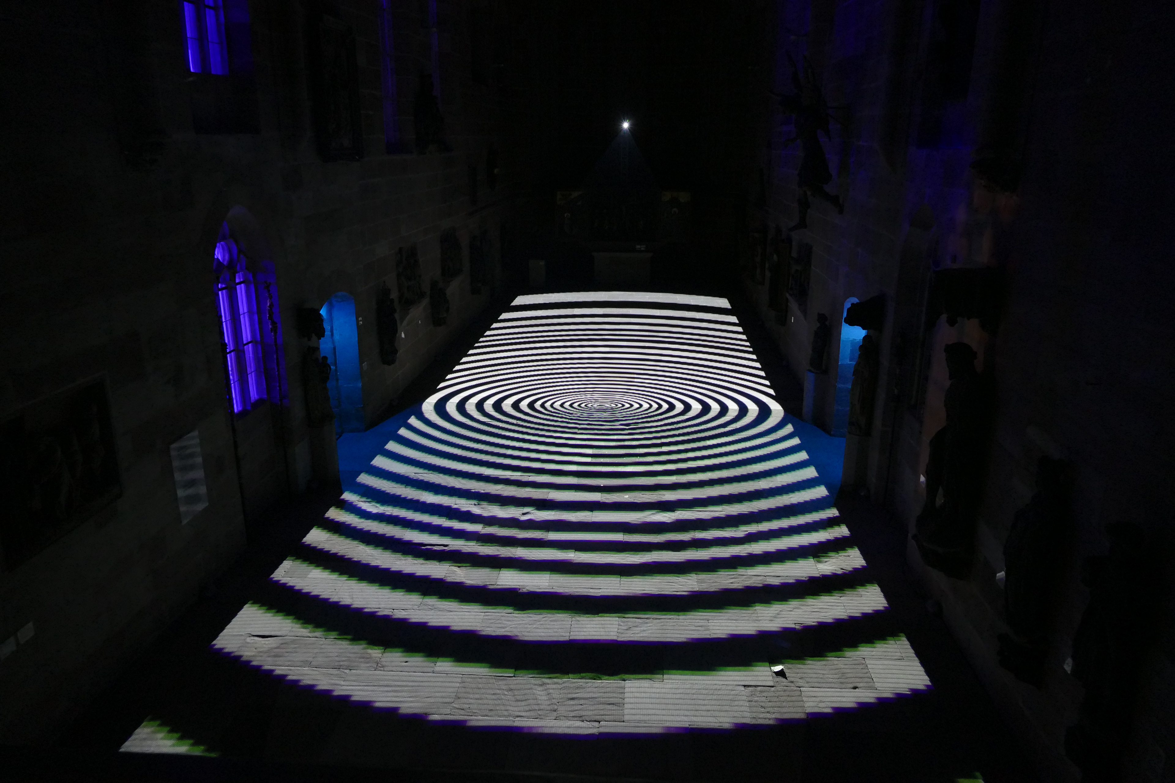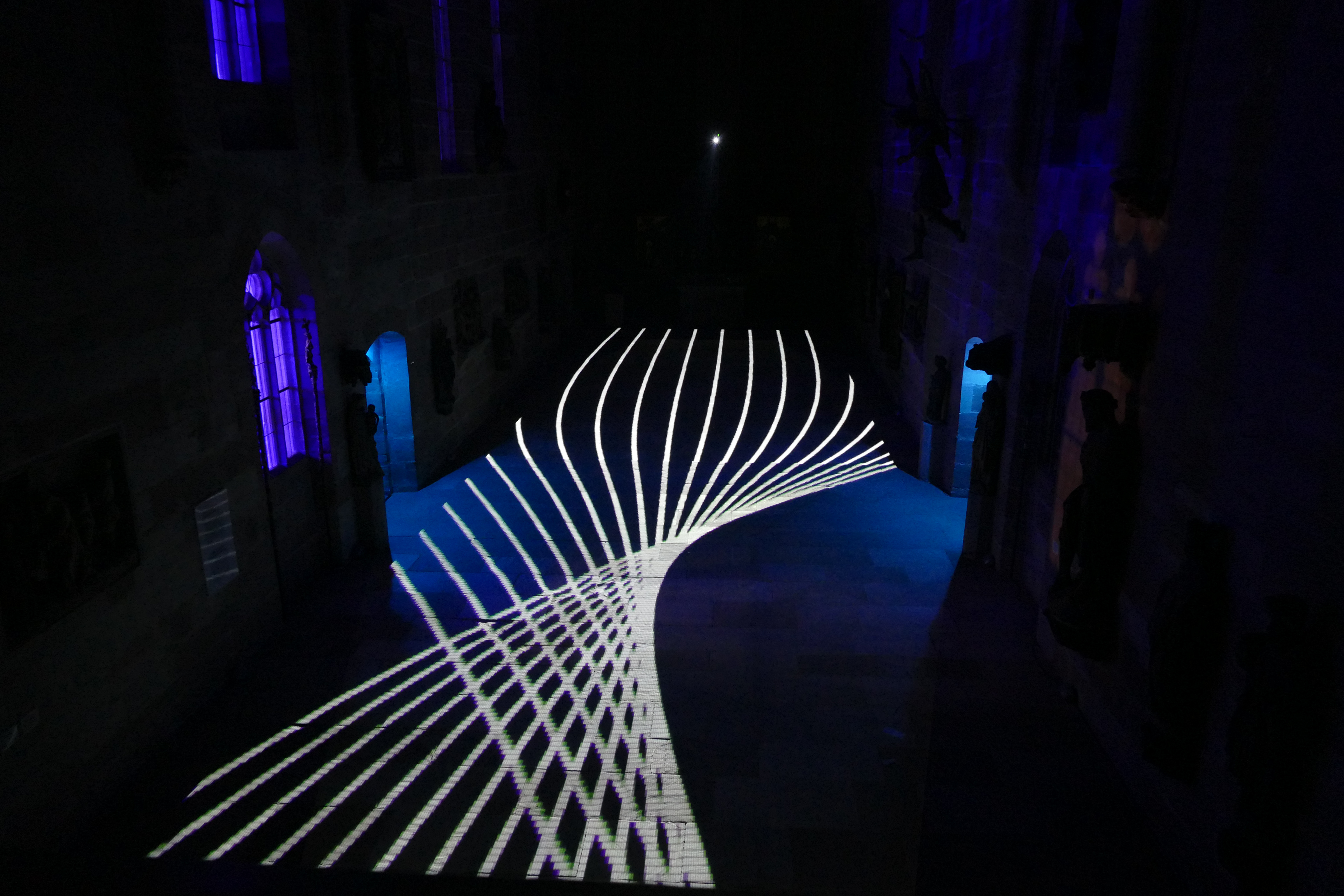 Videoinstallation im Germanischen Nationalmuseum Nürnberg, 2017 Sobald es dunkel ist, wird der Boden der Kartäuserkirche zur Projektionsfläche. Die audiovisuelle Installation Mäander skizziert mögliche Routen durch den Raum, die sich als Irrwege entpuppen und die Frage nach dem richtigen Weg stellen. Wasser fließt in der Natur nicht geradeaus, es fließt in Mäandern. Die dynamischen Linienkompositionen suchen sich ebenso ihren Weg durch den Raum und werden zunehmend rasanter bis sie sich in einer Flut aus Licht und Sound auflösen. Der Lichtteppich startet mit einem wasserähnlichen Bild und endet mit einem Kreissymbol. Alles, was dazwischen stattfindet, repräsentiert einen zeitlich verkürzten Lebensweg, eine Odyssee des Alltäglichen. Lichtstrahlen stellen eine Verbindung zwischen den Besuchenden und dem Ort her. Im Sinne des Konzepts vom erweiterten Kino (oder: expanded Cinema), wird die Projektion von üblichen Display gelöst und kann von den Betrachtenden sogar durchschritten werden. Das Publikum wird in die Präsentation eingebunden. Anstelle der kontemplativen Werkbetrachtung tritt die ephemere, multisensonale Kunstrezeption.