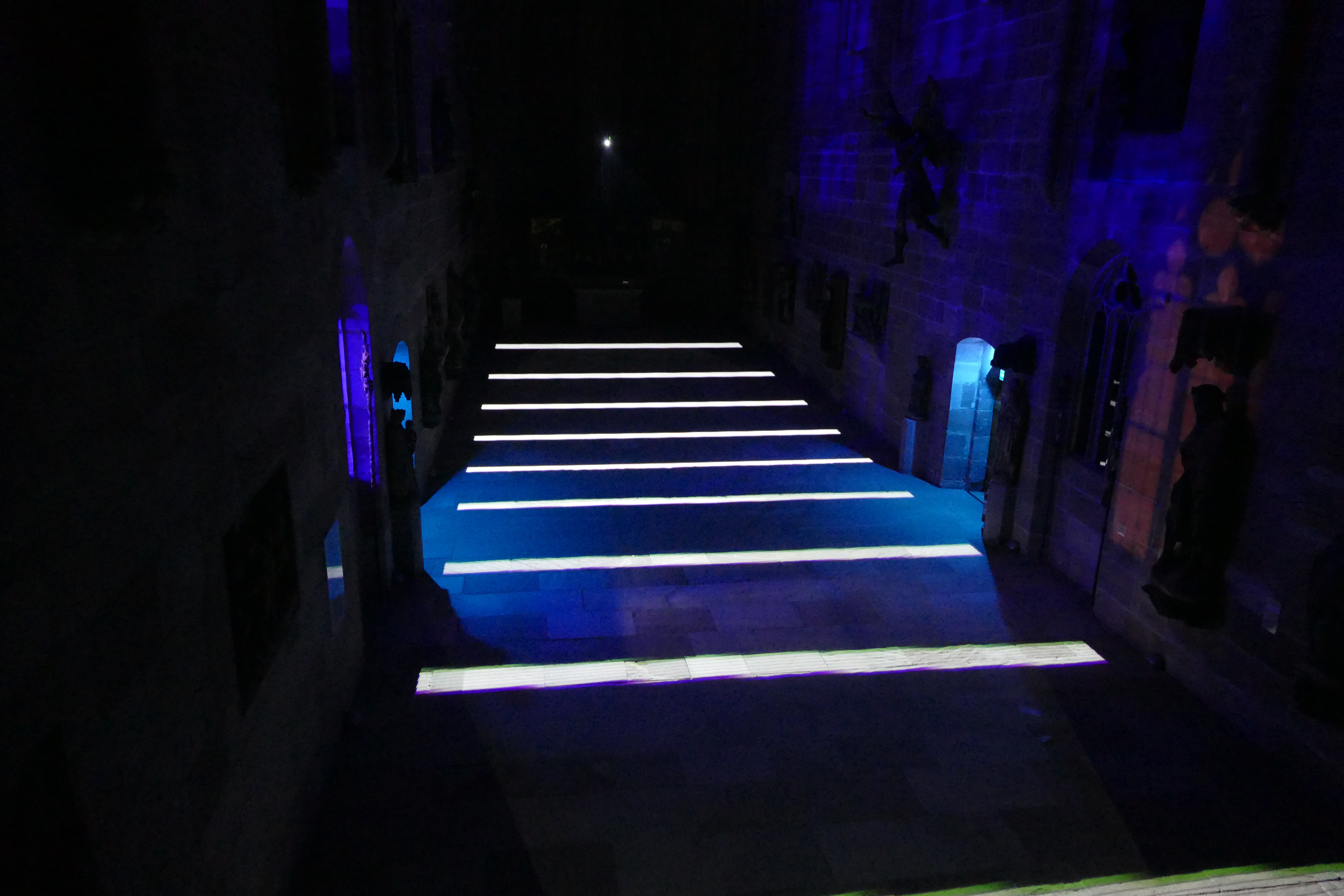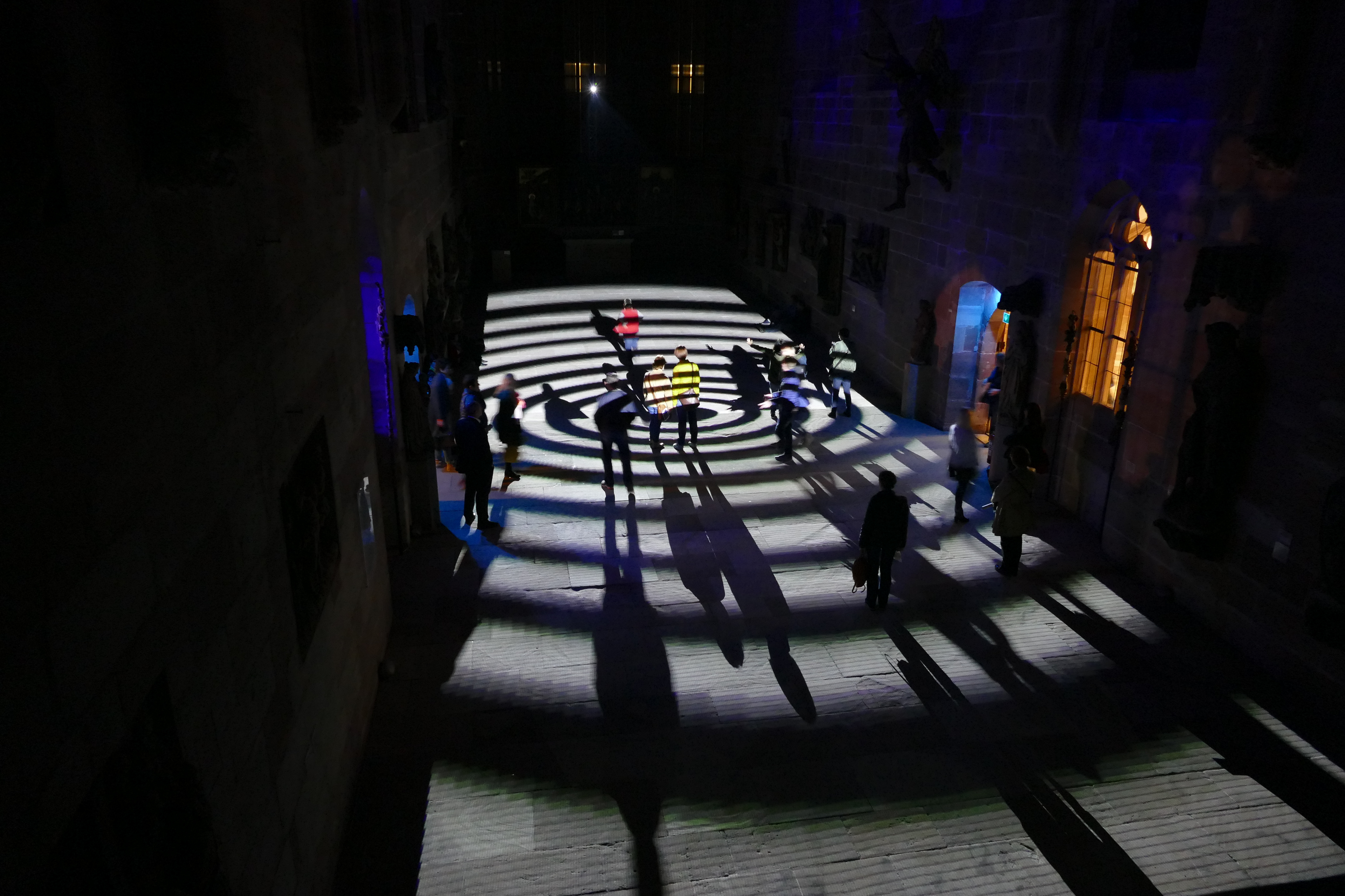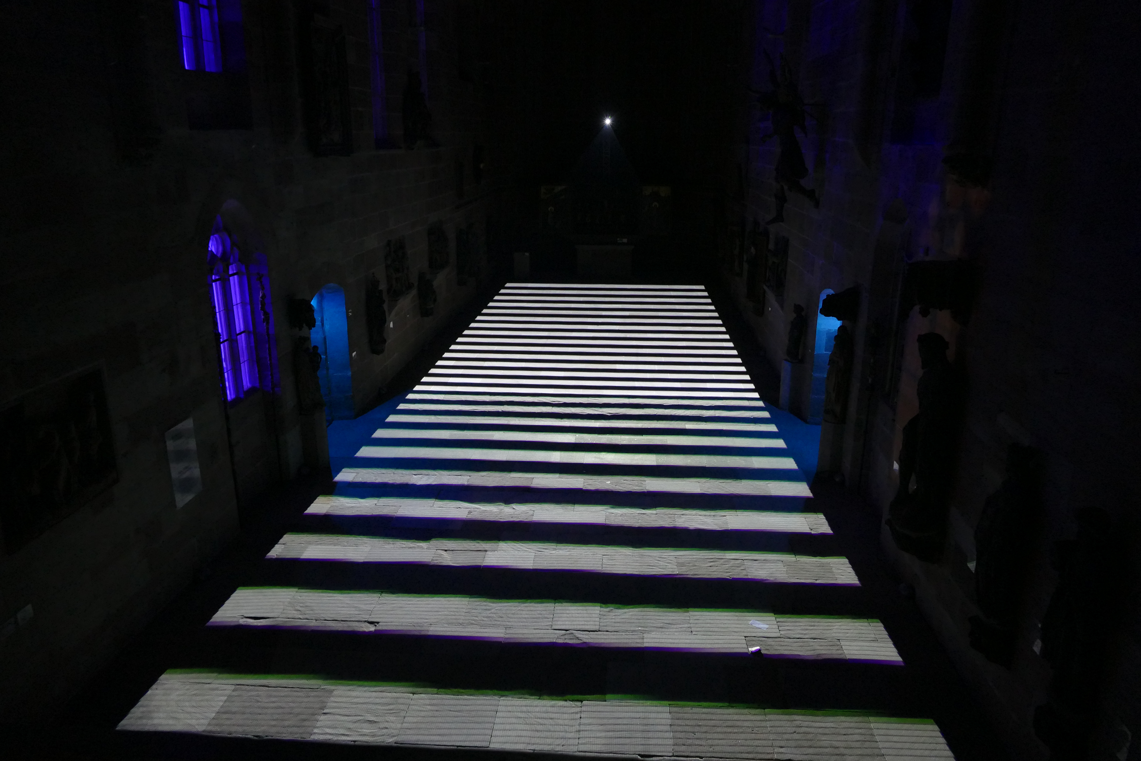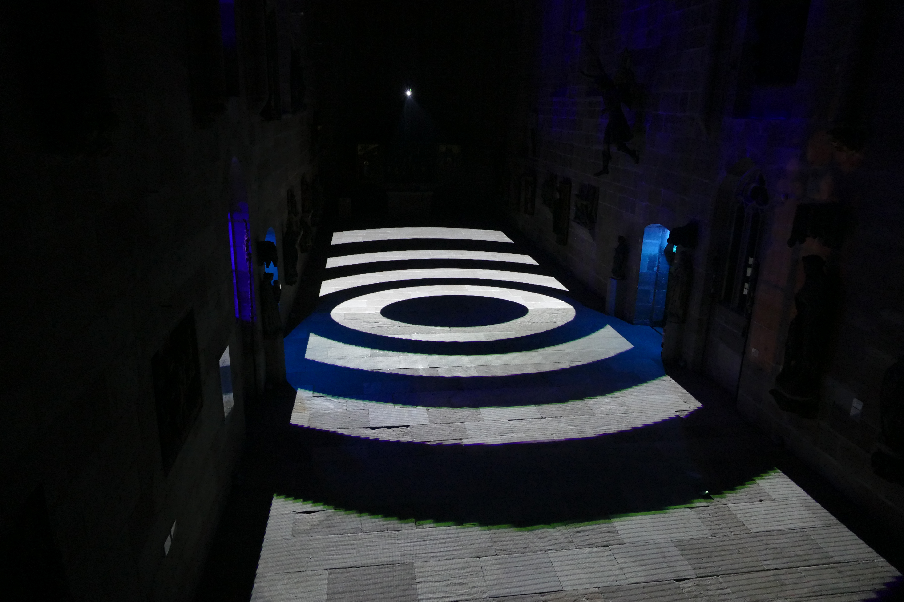 Videoinstallation im Germanischen Nationalmuseum Nürnberg, 2017 Sobald es dunkel ist, wird der Boden der Kartäuserkirche zur Projektionsfläche. Die audiovisuelle Installation Mäander skizziert mögliche Routen durch den Raum, die sich als Irrwege entpuppen und die Frage nach dem richtigen Weg stellen. Wasser fließt in der Natur nicht geradeaus, es fließt in Mäandern. Die dynamischen Linienkompositionen suchen sich ebenso ihren Weg durch den Raum und werden zunehmend rasanter bis sie sich in einer Flut aus Licht und Sound auflösen. Der Lichtteppich startet mit einem wasserähnlichen Bild und endet mit einem Kreissymbol. Alles, was dazwischen stattfindet, repräsentiert einen zeitlich verkürzten Lebensweg, eine Odyssee des Alltäglichen. Lichtstrahlen stellen eine Verbindung zwischen den Besuchenden und dem Ort her. Im Sinne des Konzepts vom erweiterten Kino (oder: expanded Cinema), wird die Projektion von üblichen Display gelöst und kann von den Betrachtenden sogar durchschritten werden. Das Publikum wird in die Präsentation eingebunden. Anstelle der kontemplativen Werkbetrachtung tritt die ephemere, multisensonale Kunstrezeption.